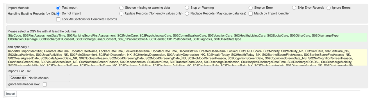 For the best results and to best identify any errors within an import please make sure the import file contains ALL fields marked as an import column within the SSNAP import specification. The fields do not have to be populated in the import file.