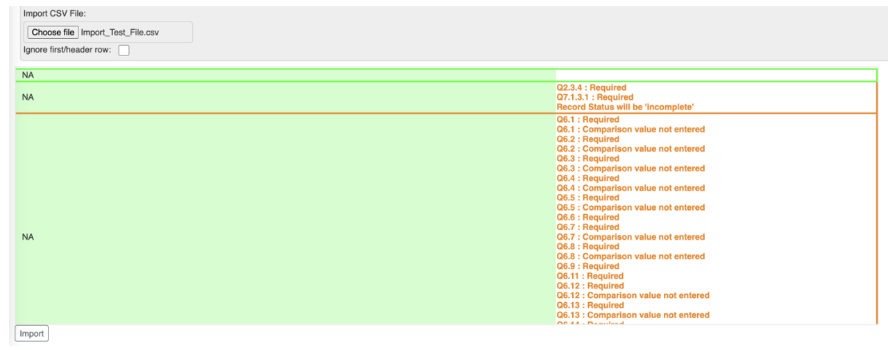 On the import screen select ‘Choose file’ and locate your desired import file. The contents of the file are then shown on the import screen. Green signifies the cell contains an accepted value and orange that the cell contains a value that is not accepted. In cases where the question cannot be blank, orange will also indicate a blank cell.