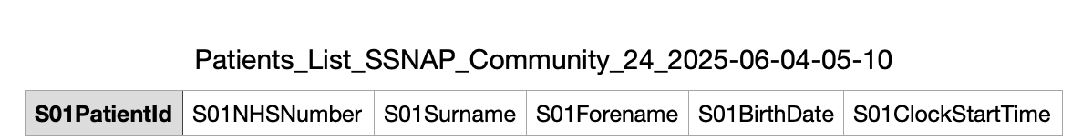 In order to retrieve a list of records which have been transferred to your team and necessary data, take the “patient_list” export. This will show the SSNAP ID, NHS number, patient name, DoB and clock start as entered by the inpatient team.