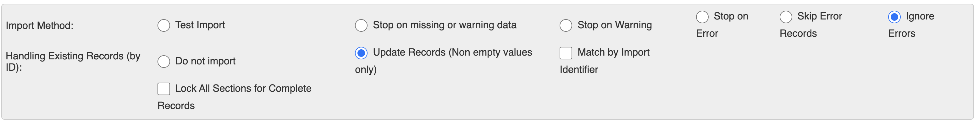 | Ignore errors | The import will proceed regardless of validation errors. Errors will be included in the processing email sent upon completion. |